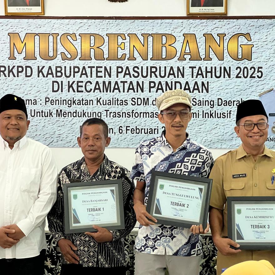 Sebelum acara musrenbang dibuka, Bapak Basmi, S.Pd. MM selaku Camat Pandaan memberikan penghargaan kepada 6 desa atas pelaksanaan musrenbanbgdes Tahun 2023 dan Tunggulwulung mendapatkan Penghargaan terbaik Ke 2.